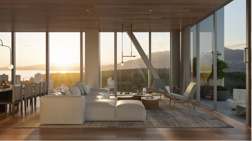 Located at 1515 Alberni Street in Coal Harbour, this 40-story landmark high-rise is expected to be completed in 2027. Studio and 1-bedroom units start at $1.1 million.